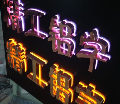 因為背發光,光體隱(yǐn)約而不強烈,所以它不適用於大型LED發(fā)光字。通(tōng)常來說,小而精致的字體多為精品發光字,講究外觀精致,極注(zhù)意細節,發光字離牆麵保持大致5CM左右距離,由(yóu)小鋼柱支(zhī)起。看圖三中右部分。常用於商(shāng)場等精品(pǐn)小店、企業LOGO等。
